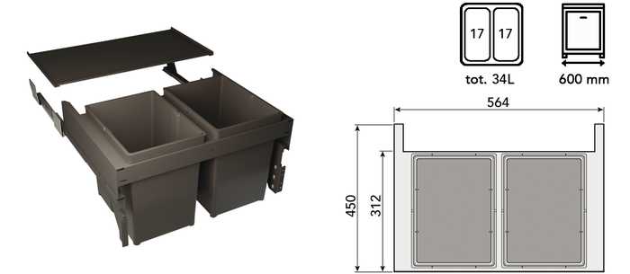 | 043110 | Antraciet | 564 x 450 x 320 mm | 600 mm | 2 x 17L | 1 stuk |