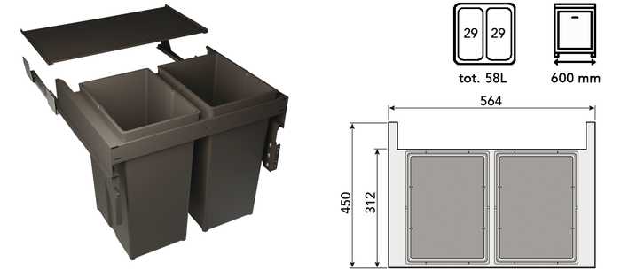 | 043109 | Antraciet | 564 x 450 x 485 mm | 600 mm | 2 x 29L | 1 stuk |