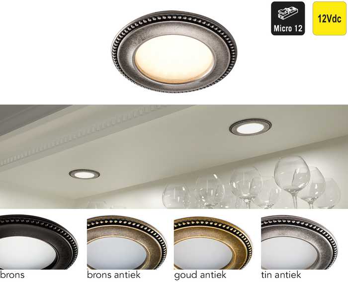 | 041566 | Goud antiek | Warm wit, 3000°K | 400 lux/120 lm | 12Vdc | 3W | 1 stuk |