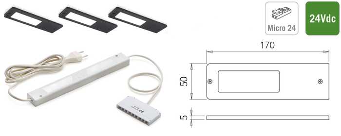 | 048408 | Aluminium | Set 3 spots | Super warm wit, 2700°K | 450 lux/300 lm | 24Vdc | 3 x 5W | 1 set |